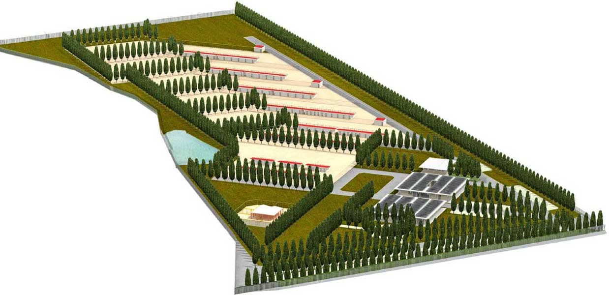 La zona di ricovero dispone di una possibilità di ampliamento per collocare altri n.15 box fino ad arrivare ad un massio di 240 cani (tutti in box da quattro posti). Per esigenze logistiche, sono previste due piccoli depositi dislocati in posizione utile lungo il percorso che distribuisce i box dell’area ricovero, così da potere essere giornalmente utilizzati dagli addetti alla gestione. Ognuna delle cinque aree ha una estensione di circa 2.000 Mq ed è direttamente collegata ad un’area di sgambamento altrettanto estesa.