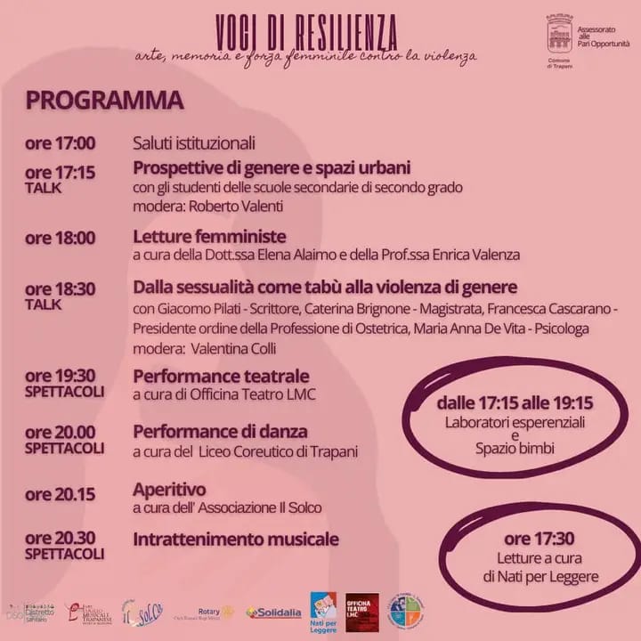 L’Assessorato alle Pari opportunità del Comune di Trapani per celebrare tale ricorrenza ha organizzato una serie di attività che si svolgeranno domani 25 novembre a partire dalle ore 17:00 presso il Chiostro del Complesso Monumentale di San Domenico con l’evento dal titolo ” Voci di Resilienza – Arte, memoria e forza femminile contro la violenza’‘. A corollario delle attività in programma è stato predisposto un servizio dedicato all’intrattenimento dei bambini, nonchè diversi laboratori esperenziali e uno spazio alle letture a cura di Nati per Leggere.
