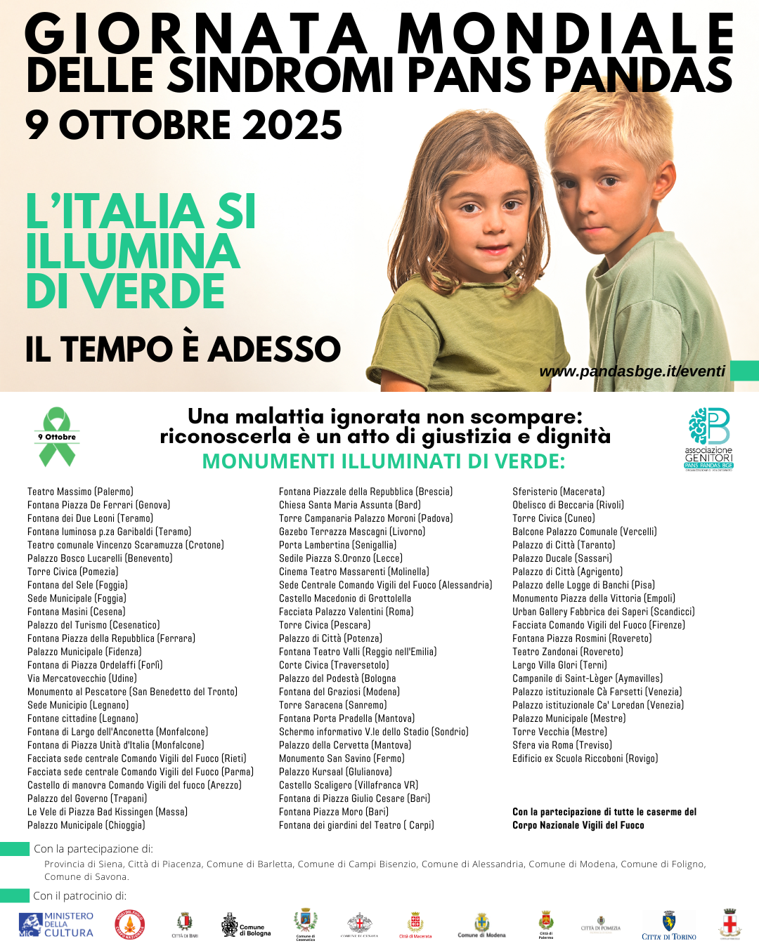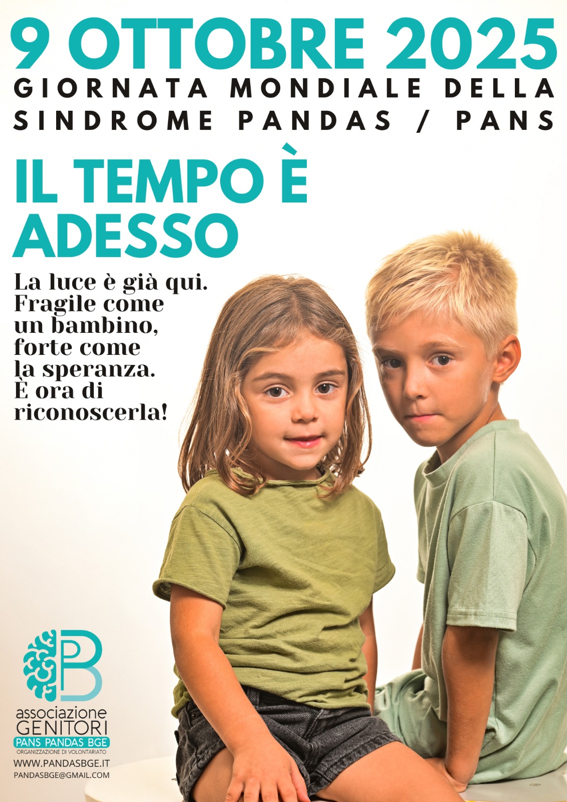 La Giornata mondiale della sindrome PANS/PANDAS 2025 è il 9 ottobre 2025, con la campagna di sensibilizzazione globale #LightUp4PANS che prevede l’illuminazione di monumenti di verde e iniziative di beneficenza e convegni organizzati principalmente dalle associazioni PANS Pandas Italia APS e Genitori Pans Pandas BGE OdV.