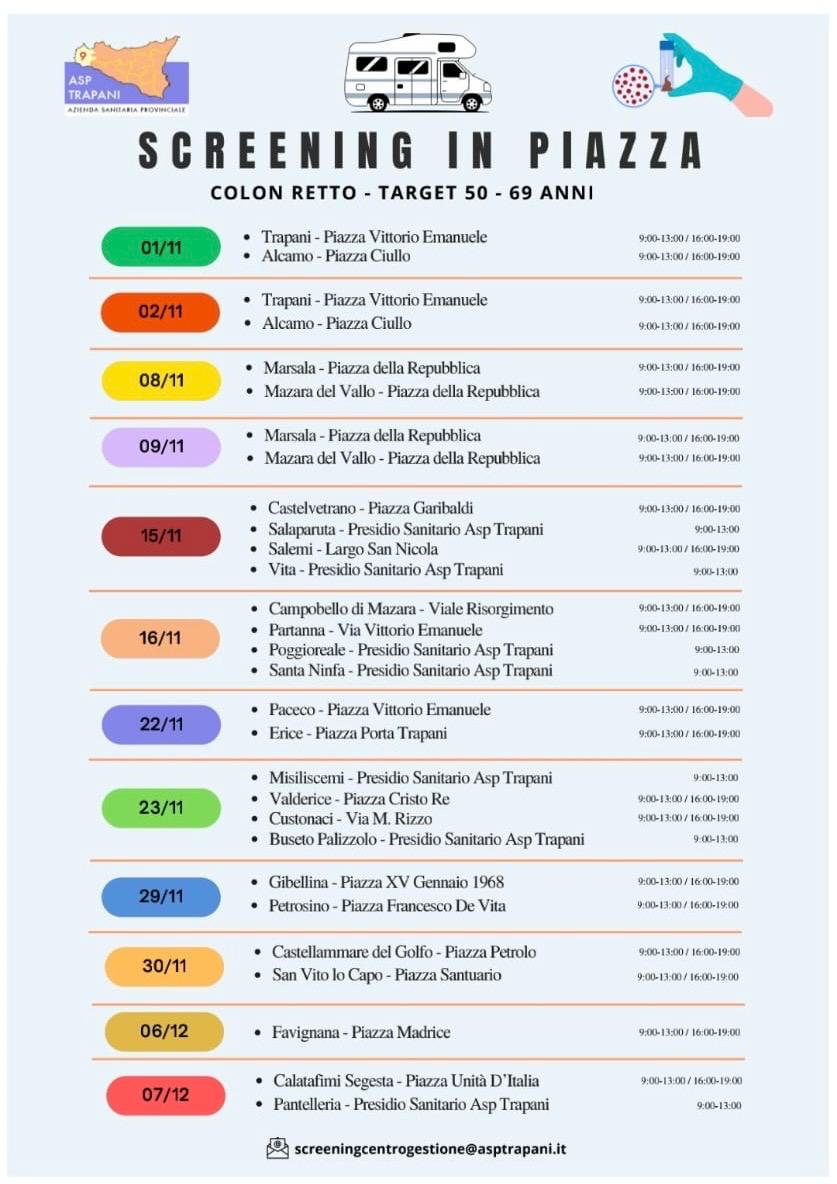 A Trapani, nelle giornate 1 e 2 novembre, presso Piazza Vittorio Emanuele, sarà possibile effettuare lo screening del colon retto, fascia di età 50-69 anni nelle seguenti fasce orarie: